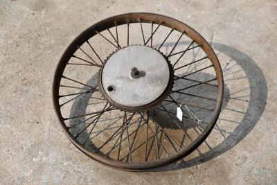DOUGLAS: A 40 spoke 20" rear wheel with brake drum complete with axle which spins, beaded rim, believed to be Douglas Model EW [Sydney] |