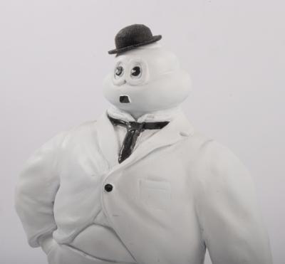 MICHELIN: A excellent Michelin Bibendum sculpture by Australian Artist Terry Lawrie in Charlie Chaplin style, featuring Bibendum in suit and tie with bowler hat and cane, approx 50cm high. Sculpture made from Hydrostone. Hat and cane are loose items.