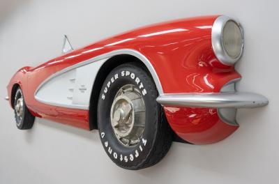 A decorative full size wall hanging of a profile of Corvette C1 in fiberglass, 110cm high, 440cm wide