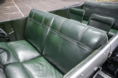Inside, the Vauxhall’s spacious cabin has been retrimmed in green leather with matching carpets and features retractable occasional seats in the rear compartment to add to its seating capacity. The turned aluminium dashboard is fitted with C.A.V and Jaeger gauges – the speedo indicating 121 miles – and a C.A.V ignition switch panel.