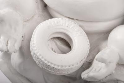 MICHELIN: An excellent Michelin Bibendum clay sculpture by Australian Artist Terry Lawrie featuring Bibendum as a Madonna and Child pose reminiscent of the famous Leonardo Da Vinci sculpture, approx 39cm high [Location: Melbourne]