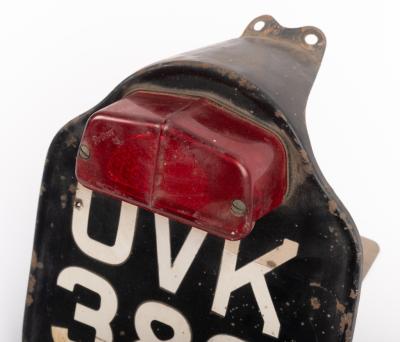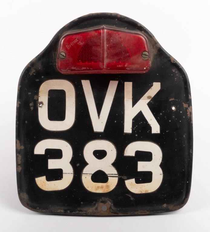 NUMBER PLATE: A British motorcycle number plate 'OVK383' with Britax stop light attached