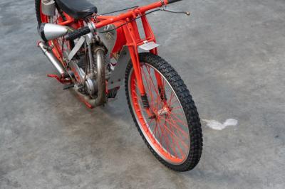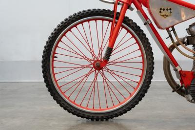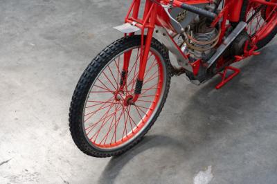Respected British speedway frame craftsman J.T. Dixon built the frame. Dixon specialized in creating lightweight, durable tubular steel frames designed specifically for speedway’s unique demands: high torque, tight cornering, and sliding over loose shale or dirt tracks.