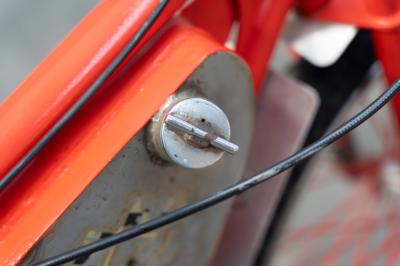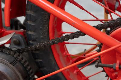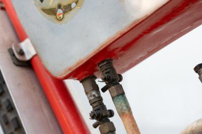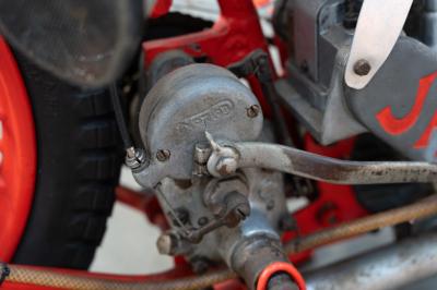 At the heart of the 1952 Dixon JAP speedway bike is the JAP 4B 500cc single-cylinder, air-cooled, four-stroke engine. J.A. Prestwich of Tottenham, North London, had been producing high-performance engines since the early 20th century, and by the 1930s and 1940s, their speedway powerplants set the standard. The 4B engine used in the 1952 model had been further refined for maximum output, simplicity, and ruggedness.