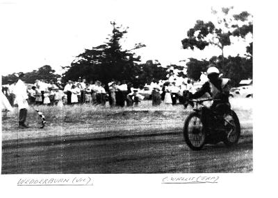 Charlies fastest time was 14.7 second terminal speed of 106 MPH (Hairy!!) with the fastest time of the day at Rob Roy Hillclimb in 1958 success at Romsey grass track, Wedderburn, Drouin Grass, Maribyrnong Hillclimb and other events.