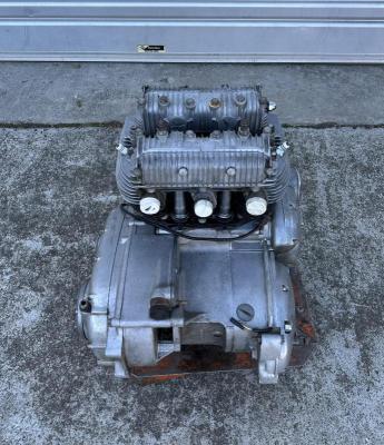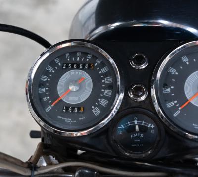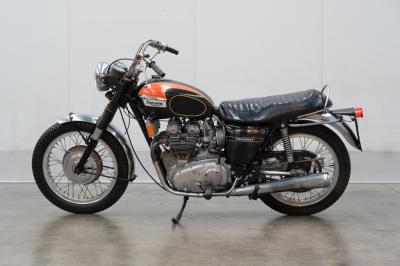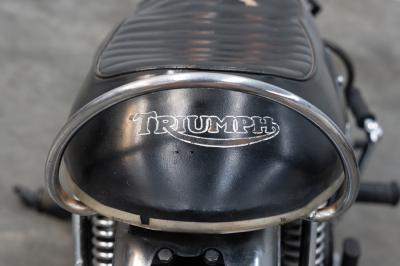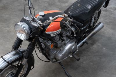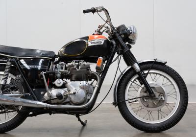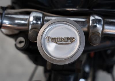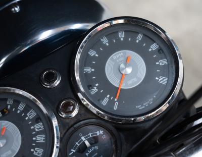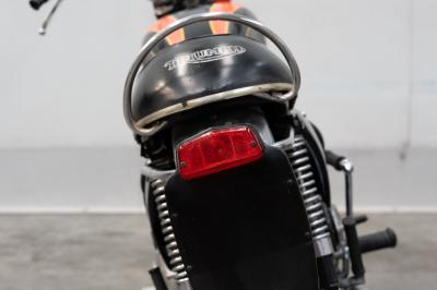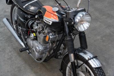 This US specification 1969 Triumph T150 is fitted with a September 1975 five-speed T150V engine. The original four-speed 1969 matching number T150T engine is included with the sale. At some stage the five-speed T150V engine has received a working electric start. The bike has been fitted with the later “beauty kit” and has a few non-original items. The rare two-tone horns are missing and a later taillight fitted. The odometer reads 25,608 miles. This Triumph T150 is offered in unregistered, running condition and would make a good project for someone wanting to make a correct matching number April 1969 build model.
