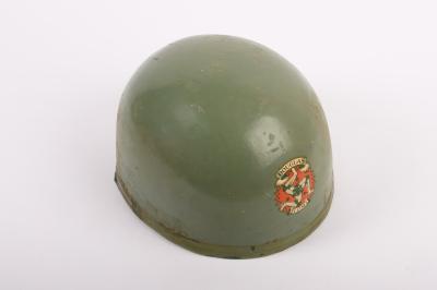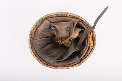 PUDDING-BASIN HELMET: A circa 1950s Cromwell 'Douglas L.O.M' applied logo, pudding-basin helmet, with neck leather [Location: Melbourne]