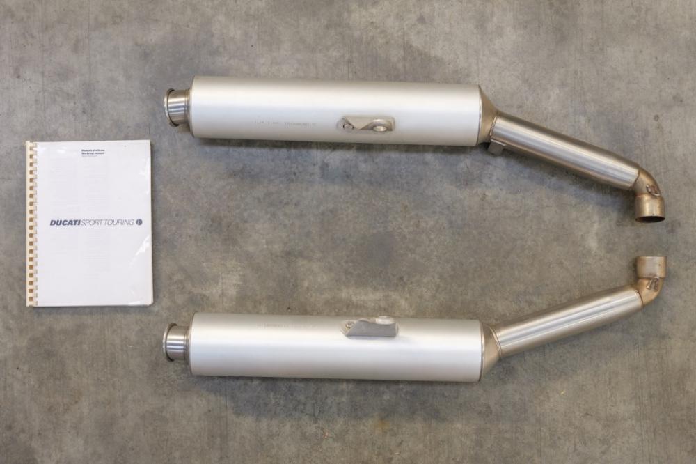 DUCATI ST4 MUFFLER: A set of Ducati ST4 mufflers, with '573.1.045.1A ARROW 28' inscribed on the side, includes a reprinted 'Ducati Sports Touring Manual'