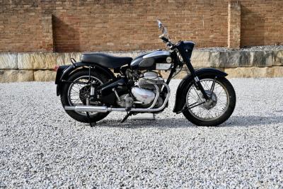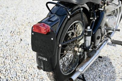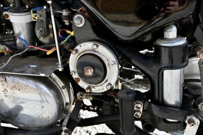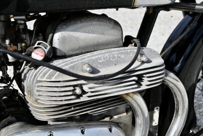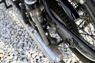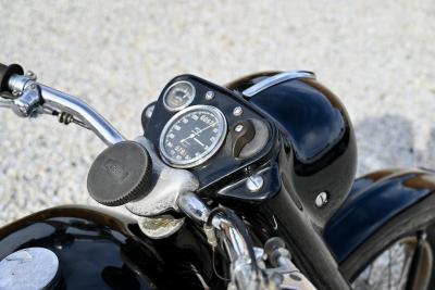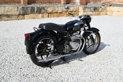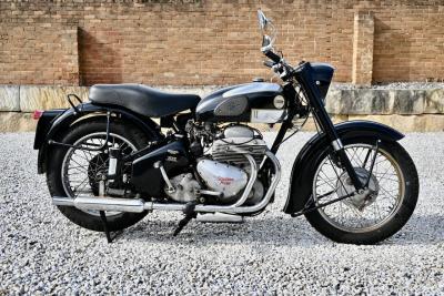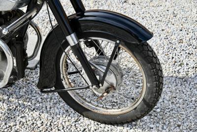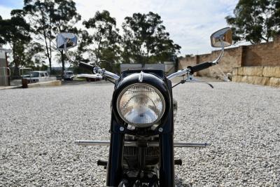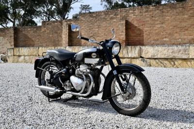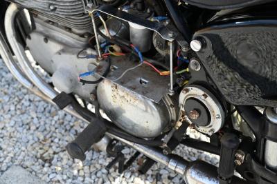 This Ariel Square Four is a late production version; the engine number falls into the range for a 1956 Model 4G Mark II, while the frame number is partially obscured as shown in the photographs. The bike appears to in very original condition but has been standing for an extended period and while the engine is free and turns, the motorcycle will require recommissioning before returning to the road. The cosmetics are generally fair, with the paint evidently re-done at some point while the chrome has light pitting, but the saddle is in good condition and most parts can be re-used. Equally importantly, the Ariel is basically complete and not missing all the hard to find parts.
