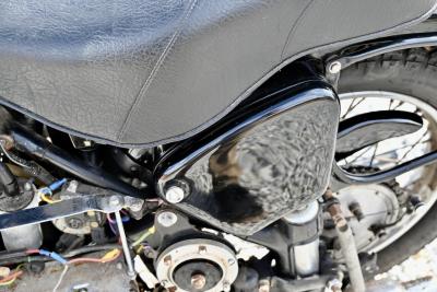 The Mark II also received a reshaped 23-litre fuel tank with more updates incorporated for 1956. A one-piece headlamp cowl was combined with the instrument panel, replacing the earlier fork shrouds and headlamp brackets. The headlamp was a new 7-inch type, the front hub now full width and the rear wheel quickly detachable. The oil tank capacity was increased from 5 pints to a gallon. This required the relocation of the toolbox to the left. Other updates included chrome plated wheels.