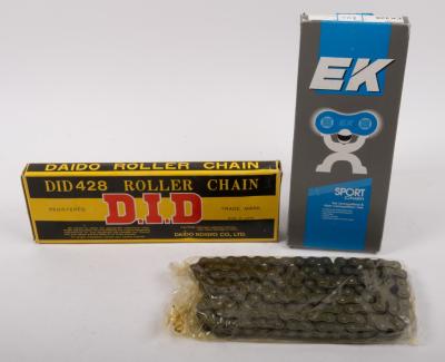 MOTORCYCLE CHAINS: Two Motorcycle chains including a 'EK Sport Chain' Part No. EK428 Links 126 and a 'D.I.D 428 Roller Chain' Links 126 made by Daidon Kogyo Co. Ltd [Location: Melbourne] |