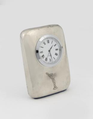 ROLLS-ROYCE: A Rolls-Royce small analogue desk clock with 'Spirit of Ecstasy' embossed to front, 8cm high, 5.5cm wide |