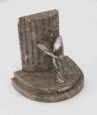 ROLLS-ROYCE: A Rolls-Royce book end with 'Spirit of Ecstasy' mounted emblem, base is marble with fluted columns at rear, mascot engraved 'S&SLTD' (Saunders & Shepherd, London), silver plaque at front reads 'G.N.C.M', 12cm high, 9.5cm deep, 12cm wide |