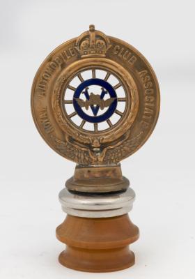 R.A.C.V: An early R.A.C.V. brass with enamel Red Ensign Australian flag & enamel RACV emblem members badge by Stokes & Sons, numbered '346', mounted on wooden base, 19cm high overall