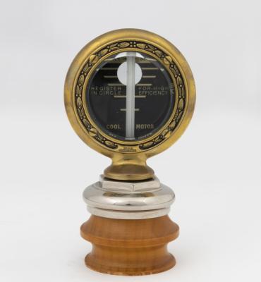 ROLLS_ROYCE: A c1900s Rolls-Royce brass radiator temperature gauge mounted on wooden base, gauge diameter 8.5cm, height 16cm overall