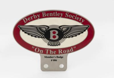 DERBY BENTLEY SOCIETY: An enamel Derby Bentley Society 'On the Road' members badge, numbered '086', 9cm high, 11cm wide