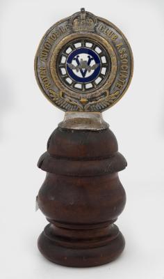 RACV: A Royal Automobile Club of Victoria (RACV) member's hood ornament badge by Angus & Coote Ltd Sydney, Member number 5291 engraved to base, mounted on tall wooden circular base, 25cm high overall