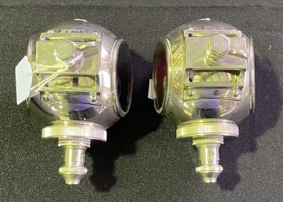 LUCAS: Two nice Lucas 'King of the Road' reproduction divers helmet tail lamps, chrome with red and clear lenses; each measures approximately 8cm wide, 12cm high.