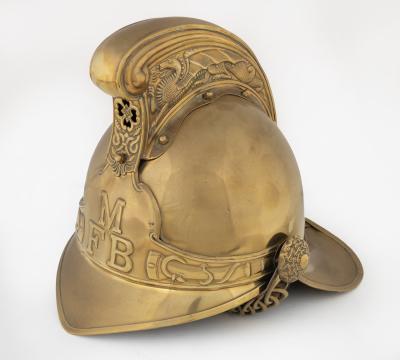MFB: A modern reproduction MFB 'Metropolitan Fire Brigade' brass helmet by 'The Brass Helmet Co' Size 8, serial no.7434. Approx 25cm high