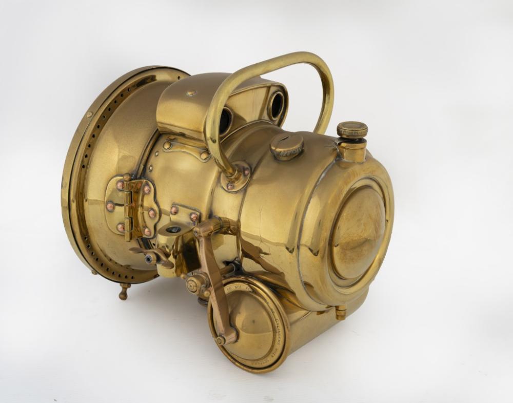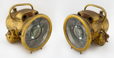 LUCAS: A pair of brass-bodied Lucas Motolite, No.384 acetylene headlamps, each measuring 18.5cm lens diameter