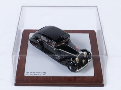 ROLLS ROYCE: An excellent 1:43 scale handbuilt model by Ilario Models France of a 1937 Rolls Royce Phantom III Mulliner 3AX79 in display case, this unusual designed PIII was owned by Field Marshall Viscount Montgomery for 20 years. Display case is marked  "RR PIII Mulliner 3AX79 Gnl Montgomerry 1937 (sic), scratches to top of case.'