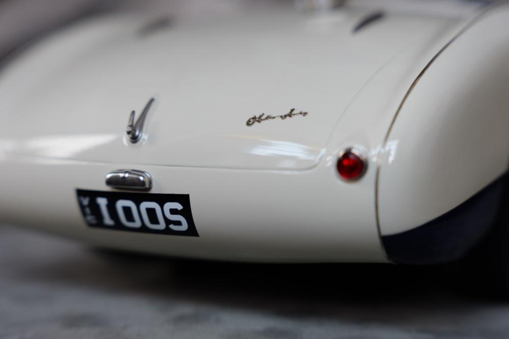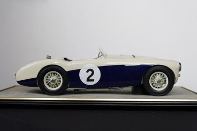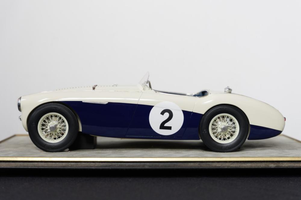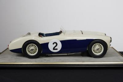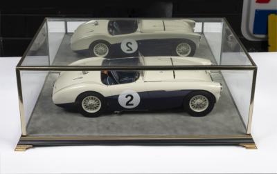AUSTIN-HEALEY: A large exceptional (likely 1:10 scale) finely detailed model of a 1955 Austin-Healy 100S chassis AHS3701, thought to be scratch built by John Shinton in the UK, presented fixed on a wood plinth base with glass showcase with mirrored backing, model itself measures approximately 13cm high, 45cm long, 16cm wide, together with a framed collage presented to David Jones in appreciation of seven years of service to motorsport in Australia, signed by significant figures including The Honourable Steve Bracks Premier of Victoria, The Honourable John Pandazopoulos Minister for Tourism, and Ronald J Walker AC CBE Chairman for AGP Corp, measures 80cm high, 52cm wide overall.