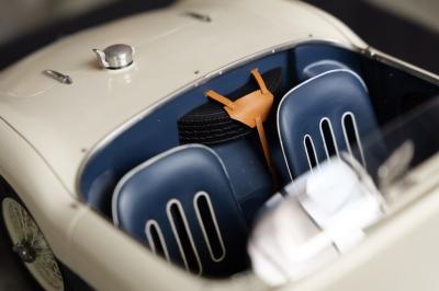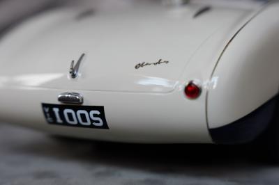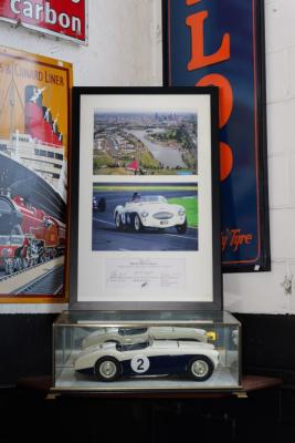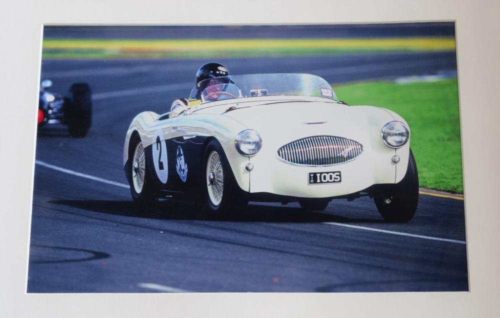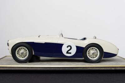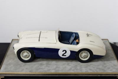 AUSTIN-HEALEY: A large exceptional (likely 1:10 scale) finely detailed model of a 1955 Austin-Healy 100S chassis AHS3701, thought to be scratch built by John Shinton in the UK, together with a framed collage presented to David Jones in appreciation of seven years of service to motorsport in Australia, signed by significant figures including Steve Bracks, John Pandazopoulos, and Ronald J Walker AC CBE