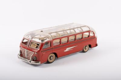BUS: A c1950s tin plate model bus, with clear plastic roof, opening featuring opening hatch, marked 'Made in Western Germany', 30cm long |
