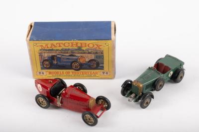 MATCHBOX MODELS OF YESTERYEAR: A pair of Matchbox models of yesteryear, number 5 Bentley 4 1/2 litre, loose no box, number 6 supercharged Bugatti type 35, in original box, both models in fair condition
