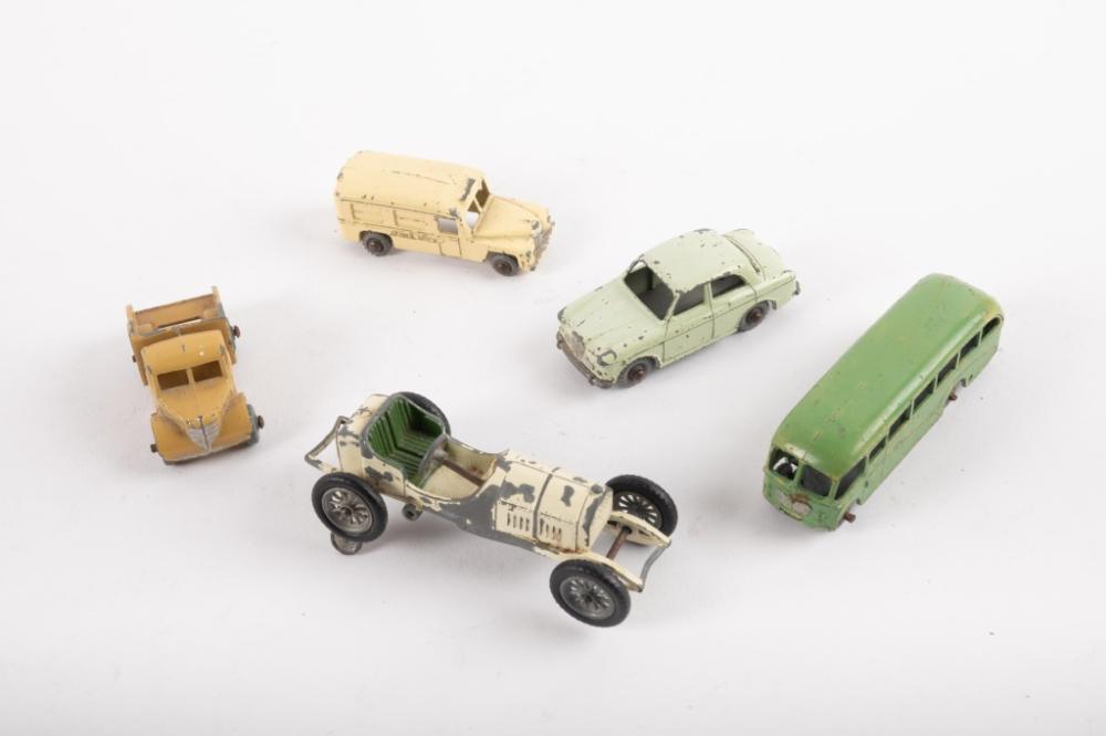 MATCHBOX LESNEY: Five Matchbox Lesney models, includes a 1908 GP Mercedes, Wolsley 1500, Luxury Coach bus and two others. Each with playwear.