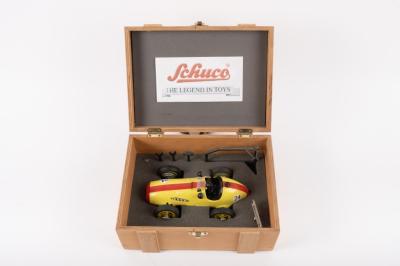 SHUCO: A reproduction Shuco tin toy wind up #1070 Grand Prix Racer model in yellow & red No.24, model within wooden presentation box with tools, key and stand