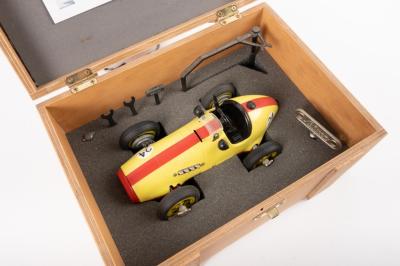 SHUCO: A reproduction Shuco tin toy wind up #1070 Grand Prix Racer model in yellow & red No.24, model within wooden presentation box with tools, key and stand.