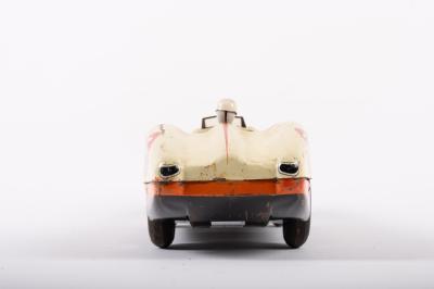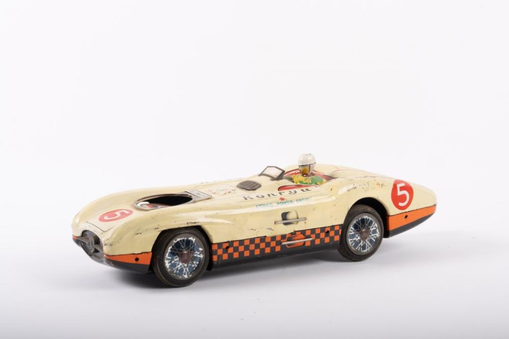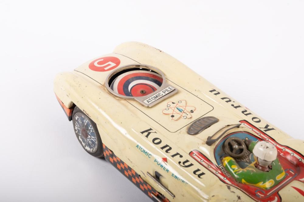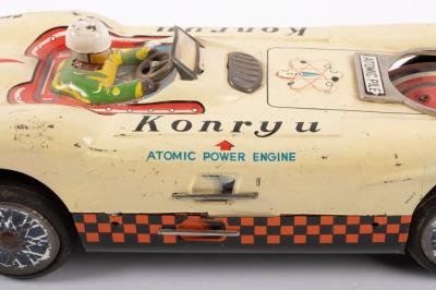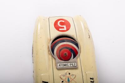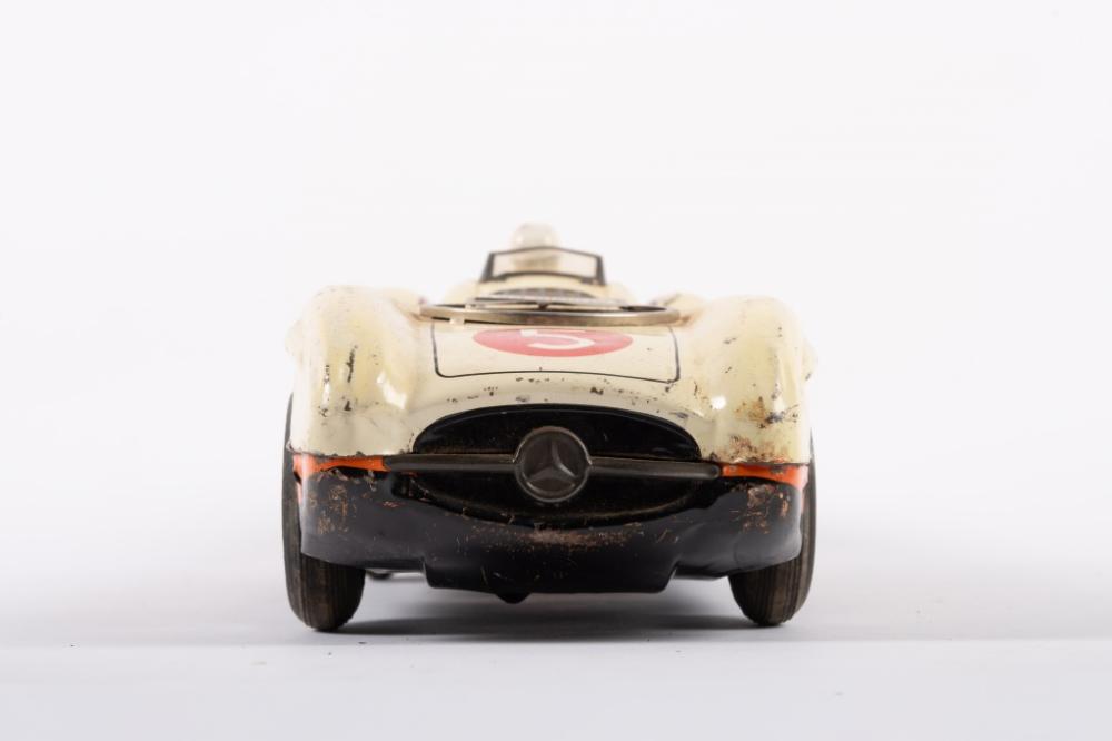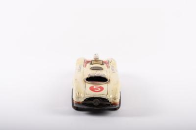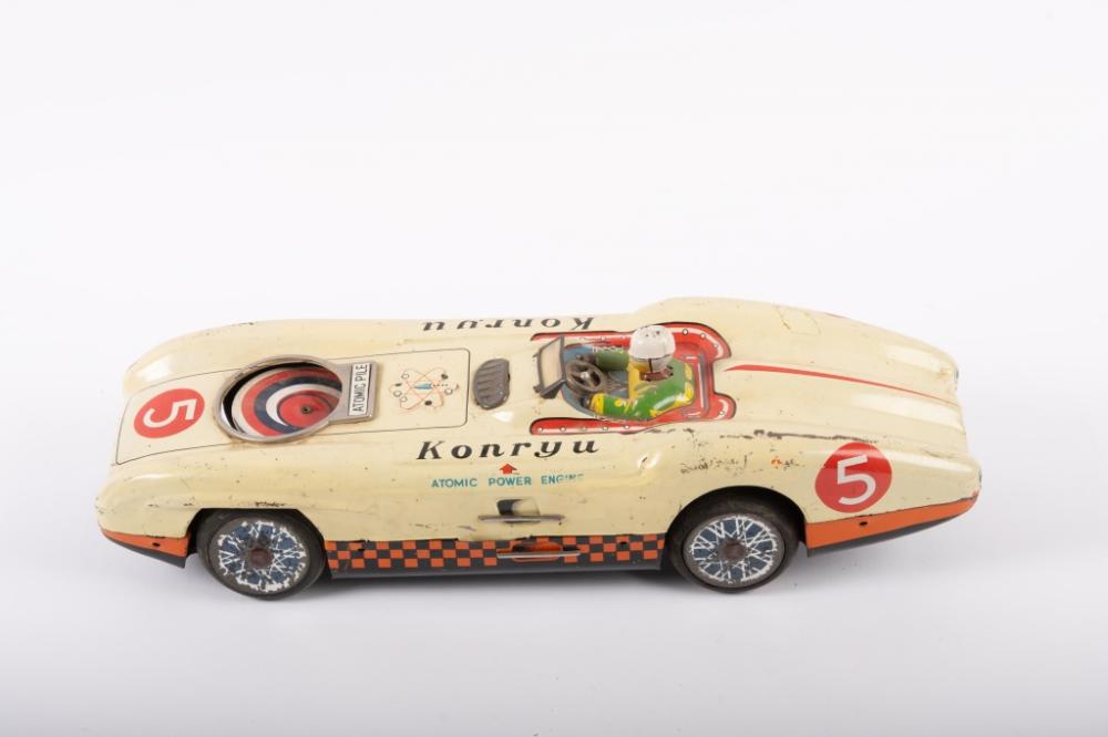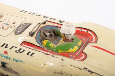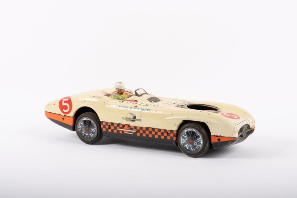 SPEED RACER: An interesting c1960s-1970s 'Super Speed Racer' by Plaything (Japan) in form of a Mercedes, 36cm long, believed to be possibly missing a covering over the 'Atomic Pile' spinning disc to the front of the vehicle.