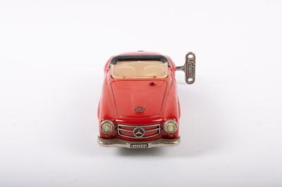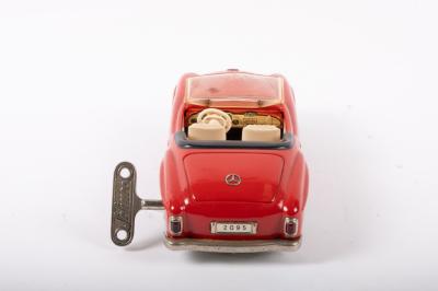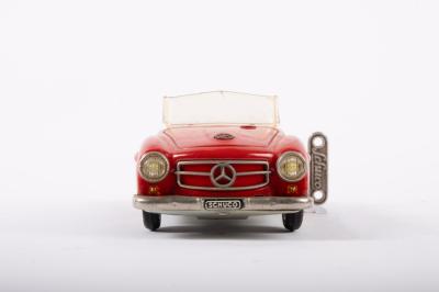 SHUCO: A late 1950s- early 1960s Shuco No.2097 Mercedes-Benz 190SL in red, wind up complete with key, made in Western Germany, 22cm long. Windsheild with damage, missing one rear hub cap.