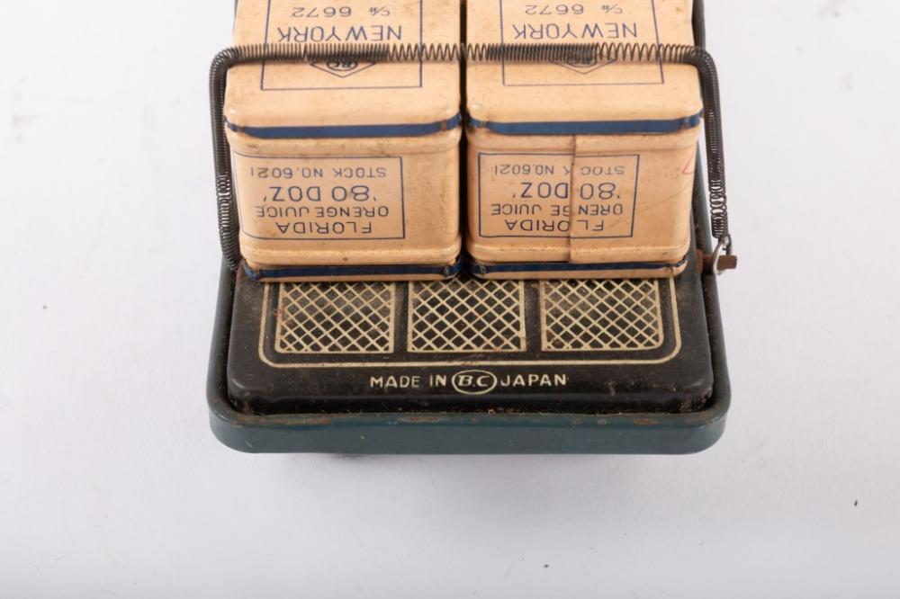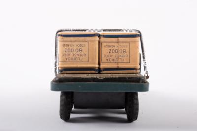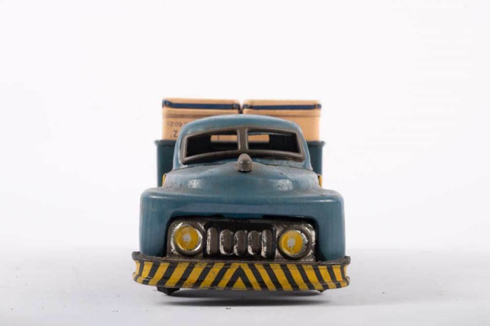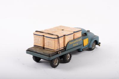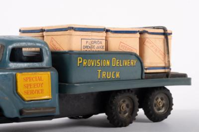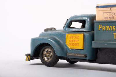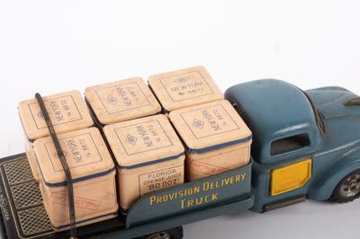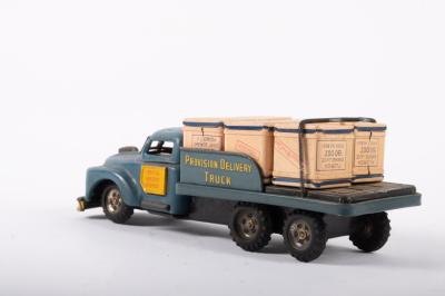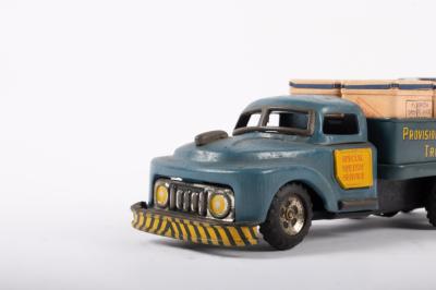 DELIVERY TRUCK: A c1960s-1970s tin toy friction drive 'Provision Delivery Truck' made in Japan, marked 'B.C', 21.5cm long, Complete with all six tin delivery boxes with removable lids.