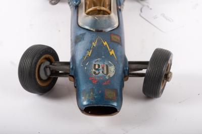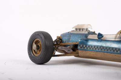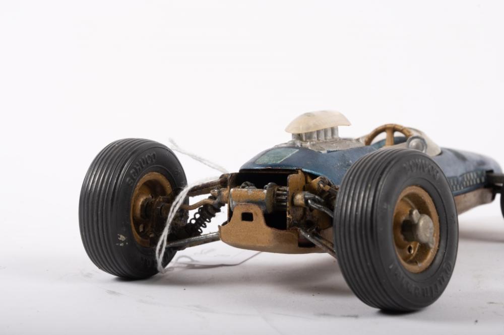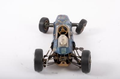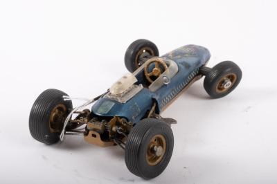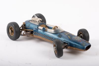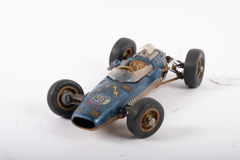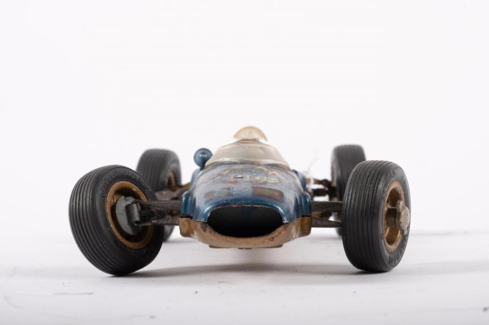 SHUCO: A late 1960s Shuco No.1071 Lotus Formula One wind up toy, made in Germany, 20.5cm long. Front wheels are missing connecting joints for axels so are slightly loose. One rear wheel slightly bent.