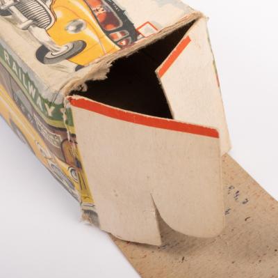 TRI-ANG: A nice c1950s Tri-ang Minic clockwork scale model No.2 Taxi, with key and original box, the car is in nice original condition, it is plastic bodied, there is a small dent to front of roof, The box is original however has one detached end flap