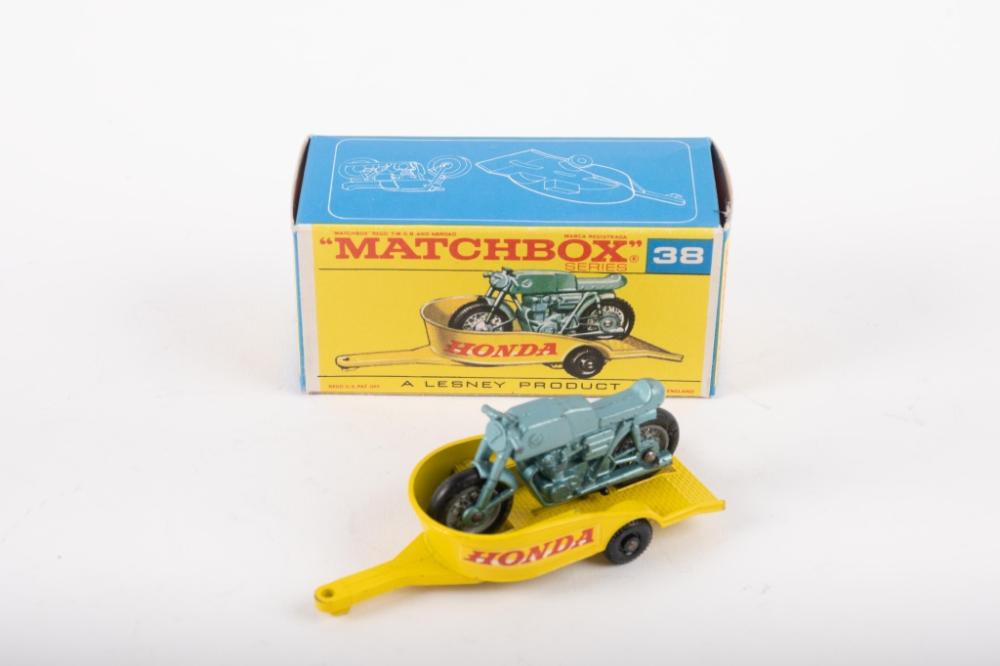 MATCHBOX: A c1970s Matchbox Series No.38 Honda Motorcycle with trailer in yellow, within original box