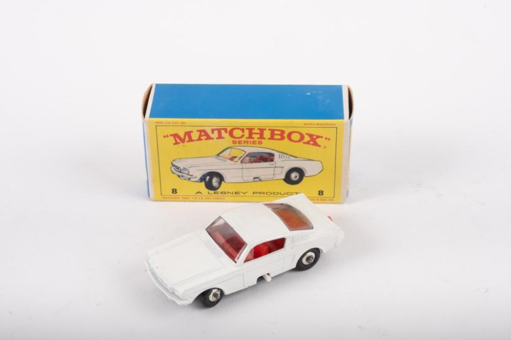 MATCHBOX: A late 1960s Matchbox series No.8 Ford Mustang in white with red interior, featuring adjustable steering, within original box