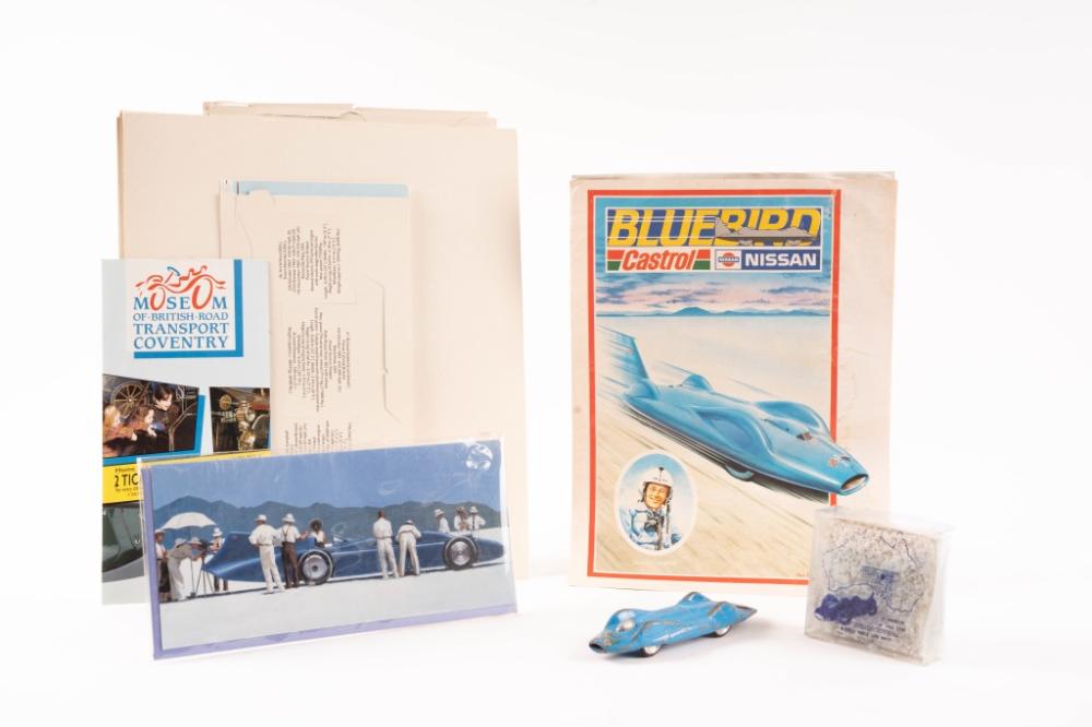 BLUEBIRD: A Corgi Toys No.153 Proteus Campbell Bluebird model, with souvenir cake of salt from Lake Eyre South Australia, along with a selection of commemorative paraphernalia relating to the Bluebird and land speed record vehicles