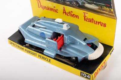 CAPTAIN SCARLET: A original 1968-1976 Dinky Toys No.104 Captain Scarlet 'Spectrum Pursuit Vehicle' with original box on display stand, complete with instruction brochure. Model is in nice condition with minimal wear, front misel compartment opens smoothly, side door with captain is jammed however opens partially, figure does not seem to be included however could be jammed within model. Box with some wear including creasing and small tears.