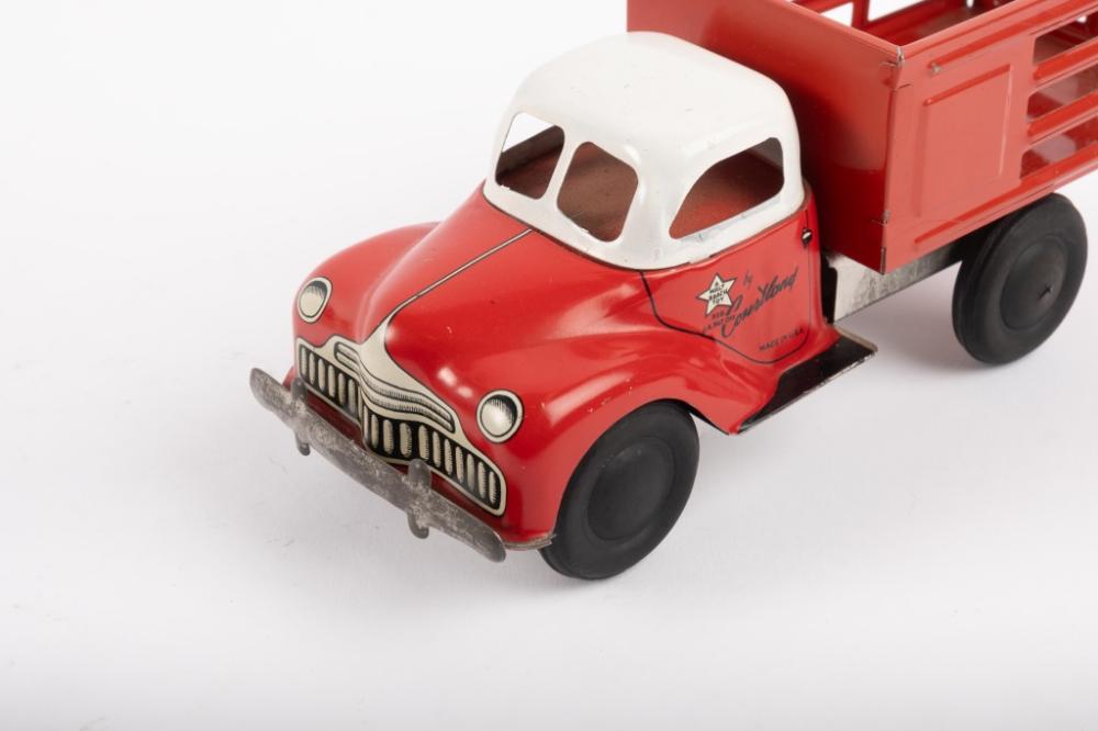 WALT REACH: A c1950s Courtland Stake Bed Truck tin plate toy by Walt Reach Toys USA, 21cm long.