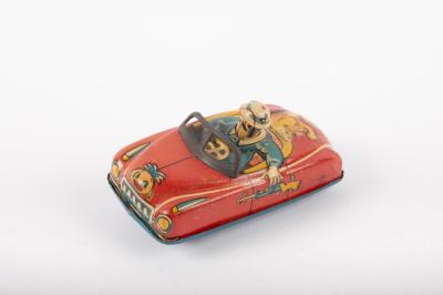 SAFARI HUNTER: A c1950s-1960s Japanese tin toy African Safari hunter car by Nomura Japan, friction driven, 9cm in length.