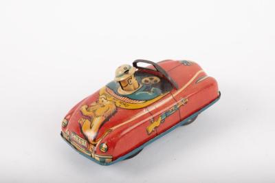 SAFARI HUNTER: A c1950s-1960s tin toy African Safari hunter car by Nomura Japan, friction driven, 9cm in length