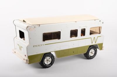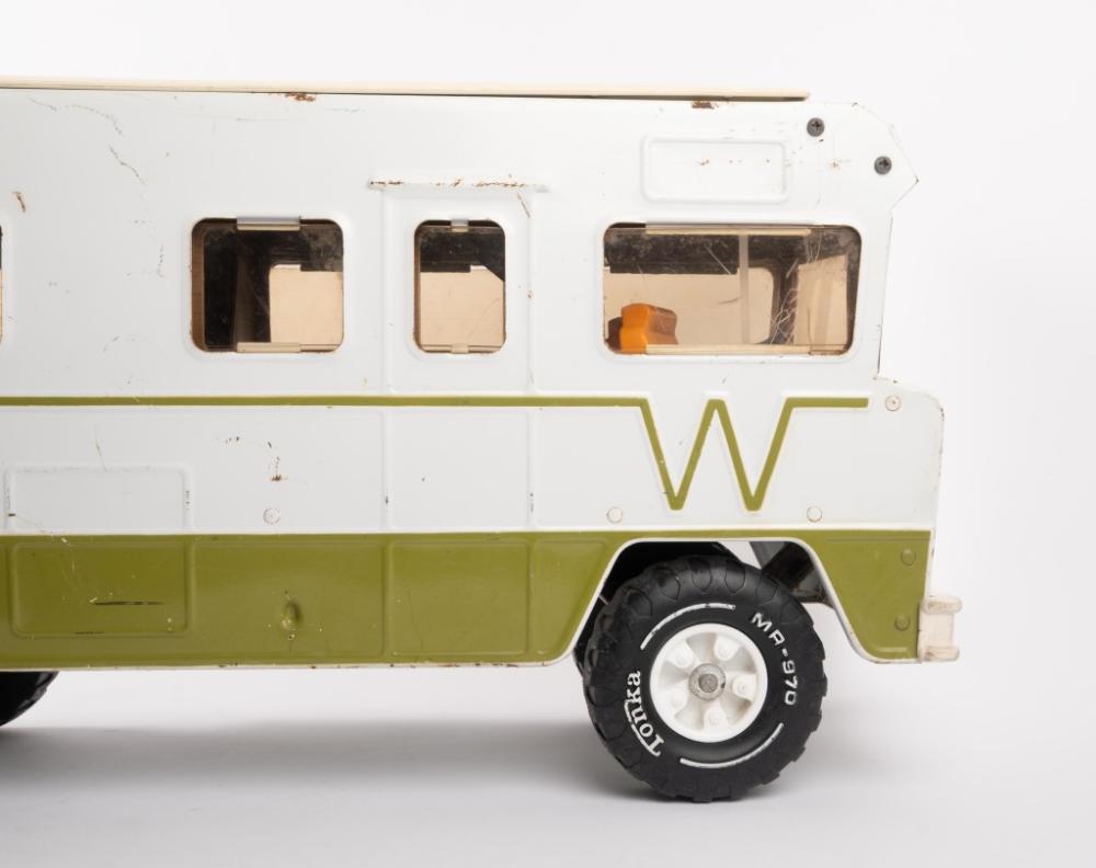TONKA: A rare large c1970s Tonka Toys Winnebago RV/Camper in two tone green on white. Features opening plastic top which extends out as a canopy, reveals the interior within featuring front sivel chairs, and various cabinetry and seating. One cabinet with broken door. Missing rear window.