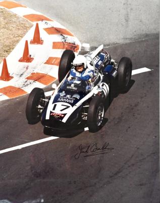 JACK BRABHAM: An unframed photograph of the Cooper T54 Indy Car by S M English signed by Jack Brabham and the photographer, 50cm x 64cm [Location: Sydney]