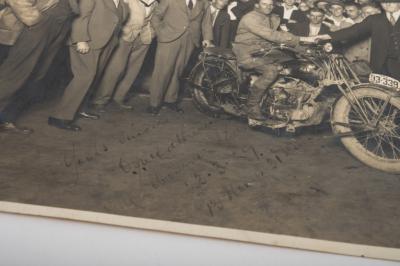 AJS: An original 1929 photograph of Cecil Weatherby sitting on an AJS after completing the Melbourne to Sydney time record attempt of 13 hours and 31 minutes on the 22nd of March 1929, photo inscribed by Cecil Weatherby, photo taken in front of P & R Williams dealership, Wentworth Ave, Sydney, 16cm high, 21cm wide