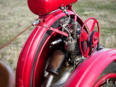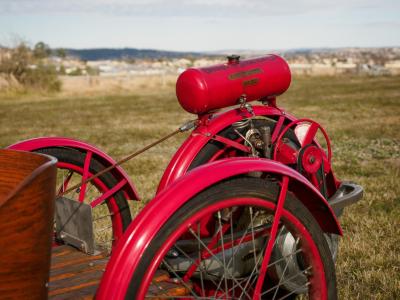 Originally sold as an inexpensive, lightweight two seat car by the AO Smith Company in Milwaukee between 1915 and 1919, Briggs and Stratton purchased the rights for the design in 1919 and relaunched the vehicle as the Briggs and Stratton Flyer. The simple ash and hickory framing combined rudimentary coachwork with suspension, the fifth, driving, wheel being mounted on a pivot at the rear and arranged in-unit with the single cylinder engine. A lever allowed the engine to be lifted up for starting and lowered to move forwards, and speeds of 15 to about 45kmh per hour could be achieved. Popular in the early 1920s, by the 1930s the model was supplied with an electric motor instead of the petrol version.  This example’s original owner in America sent the engine back to Briggs and Stratton in 1961 to be reconditioned at a cost rather higher than the original US$125 purchase price and had the rest of the car restored professionally in Florida.  A number of small adjustments were made at the factory at the owner’s suggestion including bracing the fenders, which also act as brake drums, and lengthening the control cables. The car was exported to Australia by Queensland Ford Model T enthusiast Merv Kroll in 2008 and spent time in Queensland with one other custodian until joining the vendor’s private transport collection in Goulburn NSW.  Documentation includes the earlier history of this vehicle and an Australian Government Import Approval from 2008. It has recently been recommissioned and is running and roadworthy, should one be game enough! One of an extremely small number of documented original Briggs & Stratton Flyers to survive.