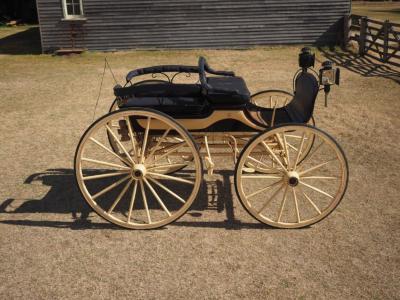This beautifully proportioned Canoe Wagonette is constructed on a Concord spring undercarriage with additional transverse spring at the rear. The elegant coachwork has seating for six, with “Californian” scrolled seat irons, a low rear entry door and steps for passengers, and brakes with a combination hand and foot lever. An attractive pair of carriage lamps are fitted to the high canoe shaped front.The seats have steam-bent open backs trimmed and pleated in blue leather to the original pattern. The carriage was completely restored in 2005 in Braidwood NSW with new wooden hub wheels with channel and rubber tyres, all nuts and bolts were replaced, and the original coachwork carefully repainted in the original livery. It was then used regularly around Braidwood until 2019, drawn by both a pair and single horses, and is in excellent safe driving condition. The vehicle has a wider than standard track making it extremely stable at speed.